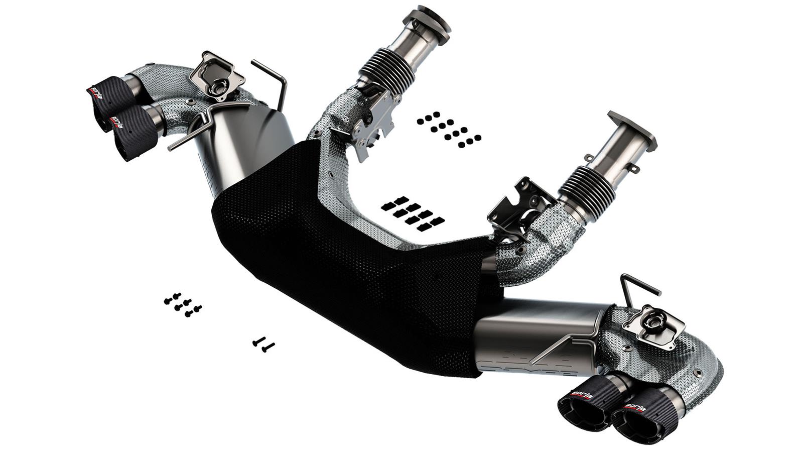 Developing exhaust systems for the C8 Corvette presented Borla engineers with unique challenges, but the team was up to the challenge. Great care was taken to ensure the integrity and function of each system as well as the vehicle itself. Cat-Back system 140838CF includes both AFM and NPP dual mode exhaust valves. The S-Type sound level delivers an aggressive, yet balanced sound with a deep tone for a more exciting driving experience without any drone. It features both Polyphonic Harmonizer and SwitchFire technology. Borla’s Polyphonic Harmonizer technology utilizes patented units containing pipes of different diameters and lengths—to create multiple exhaust notes that harmonize to deliver a clean, rich, full-bodied sound. Completely eliminating the turbulent center intersection of a standard X-Pipe, Borla’s patented SwitchFire design truly blends the combustion pulses from both sides of the engine for improved performance and a custom aggressive sound.